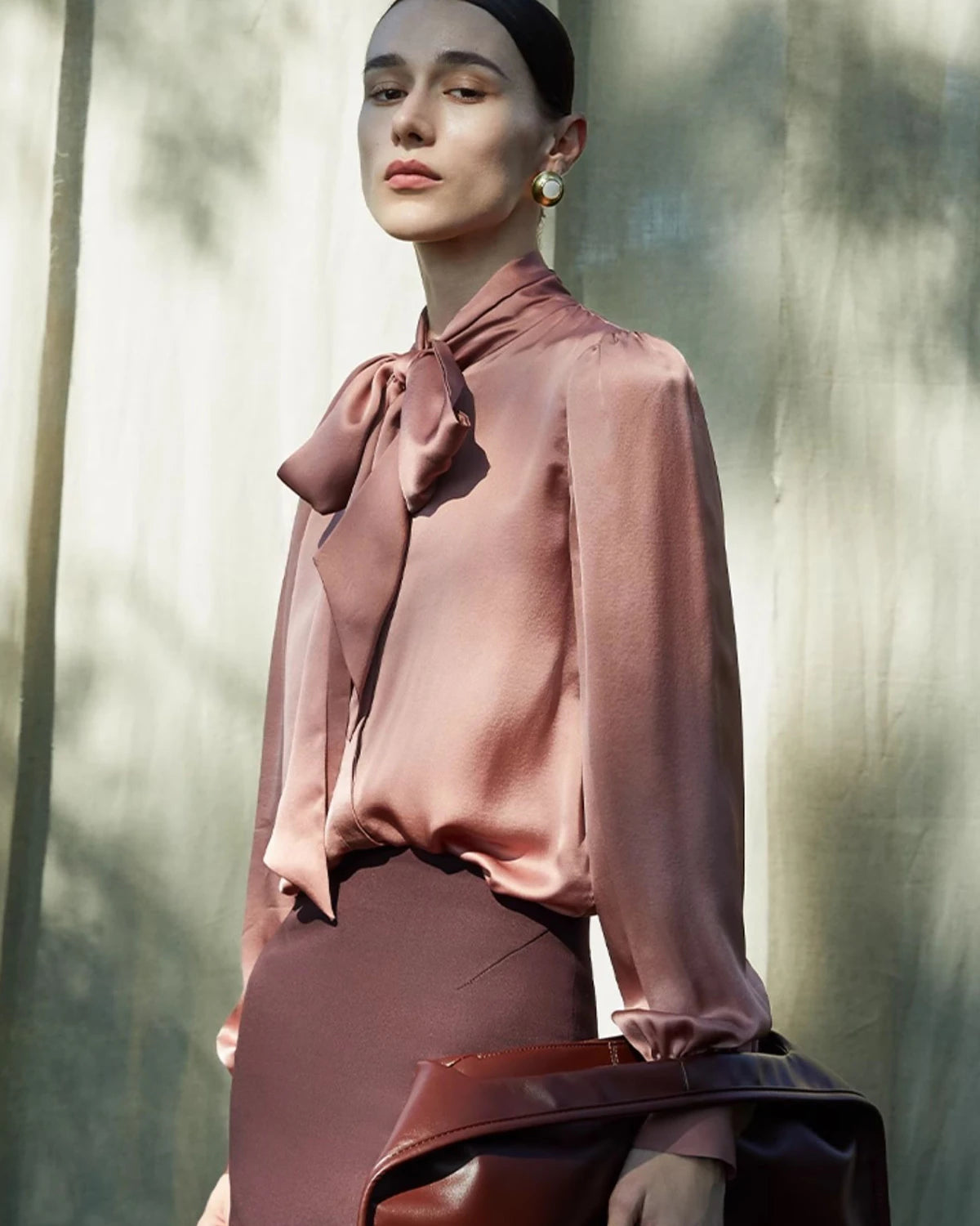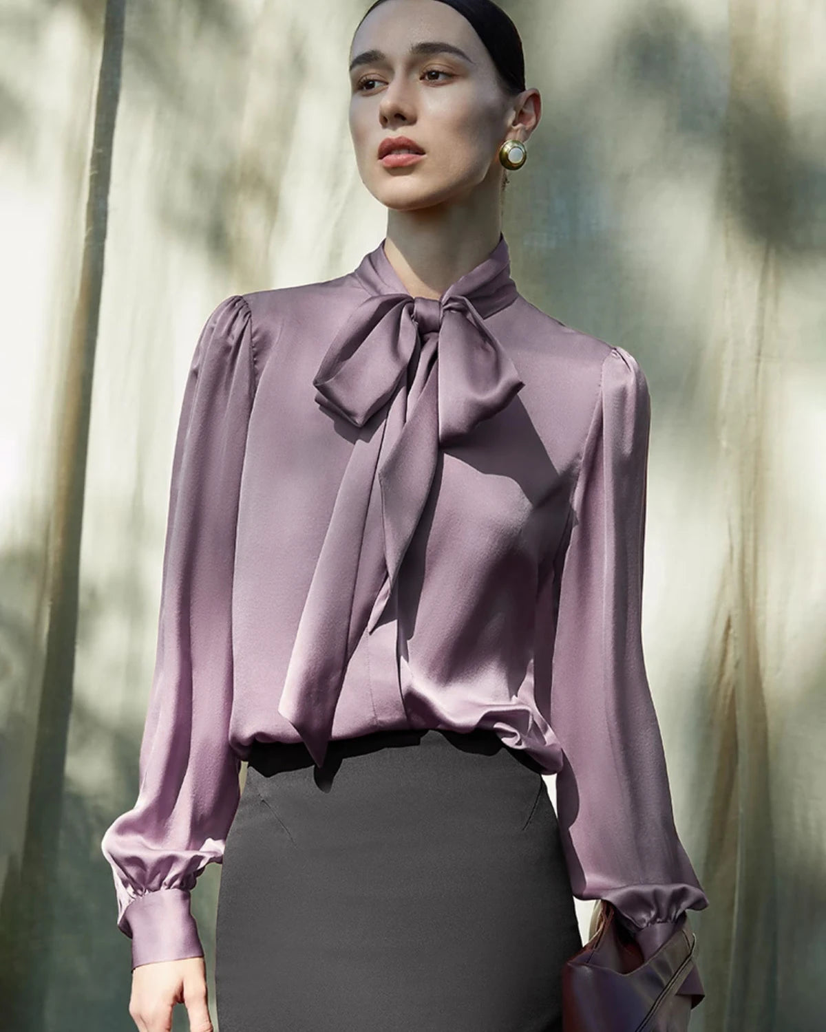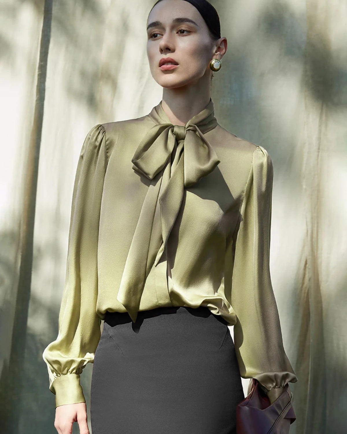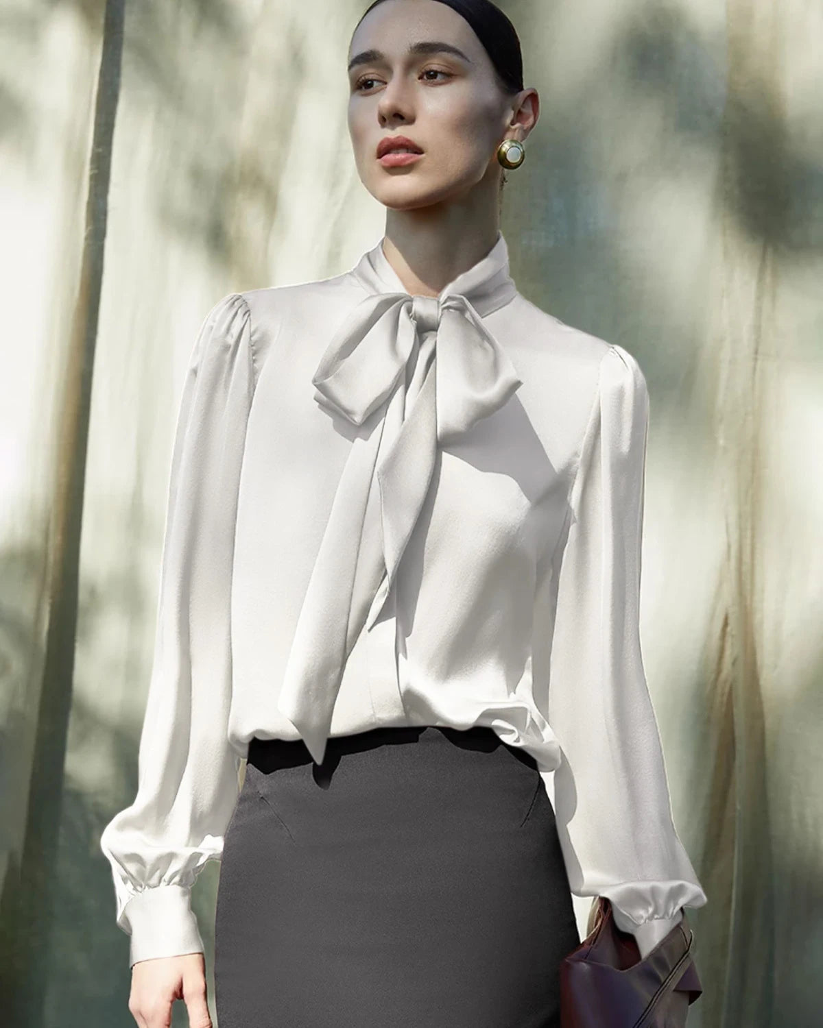 La soie satinée épaisse de qualité supérieure est plus résistante, moins froissable et plus durable qu’une blouse en soie classique, faisant de cette pièce un véritable investissement pour votre garde-robe.