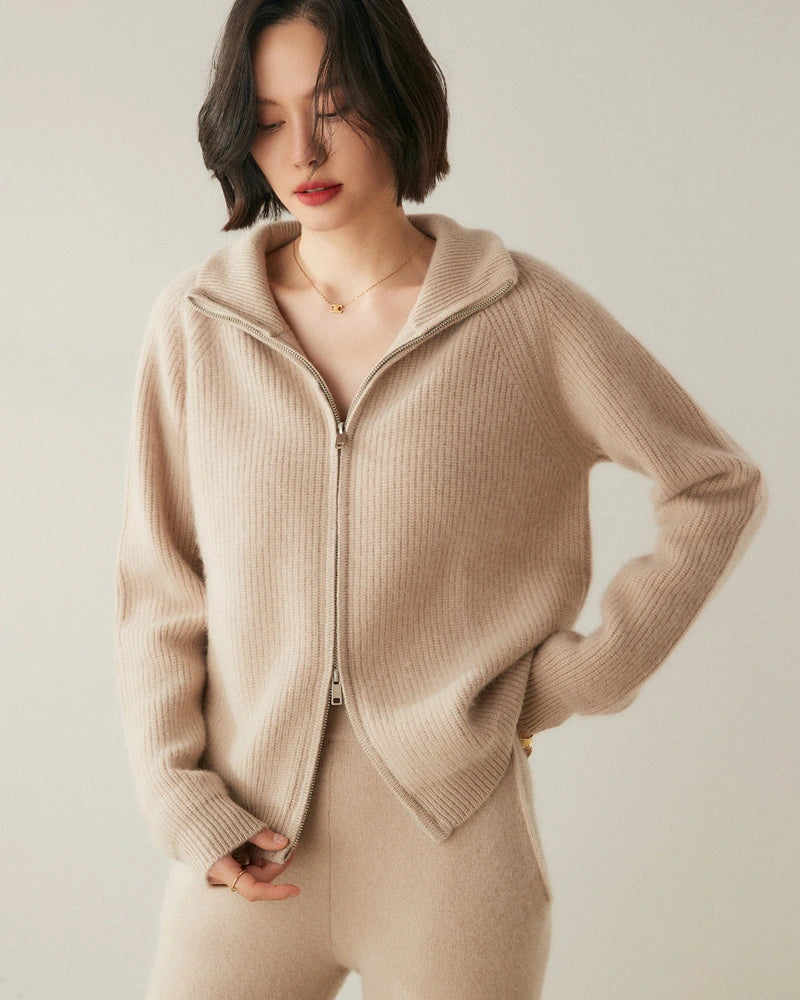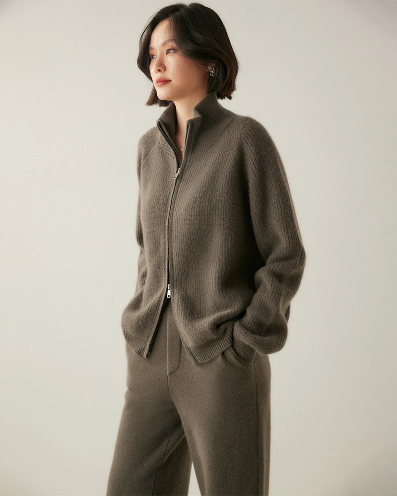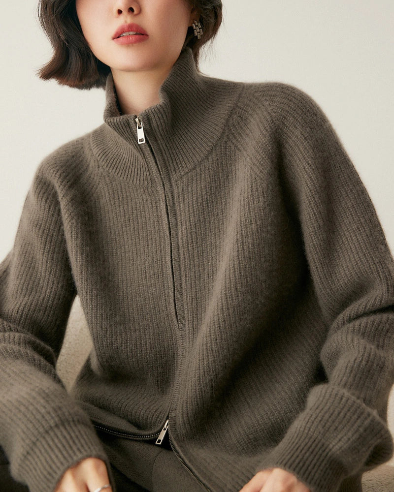 Ce cardigan zippé pour femme est confectionné dans un mélange premium de cachemire et de laine, offrant un parfait équilibre entre douceur, chaleur et durabilité. La texture tricotée procure une sensation lisse et une isolation naturelle — une alternative élégante au pull en laine classique ou à la veste en polaire.