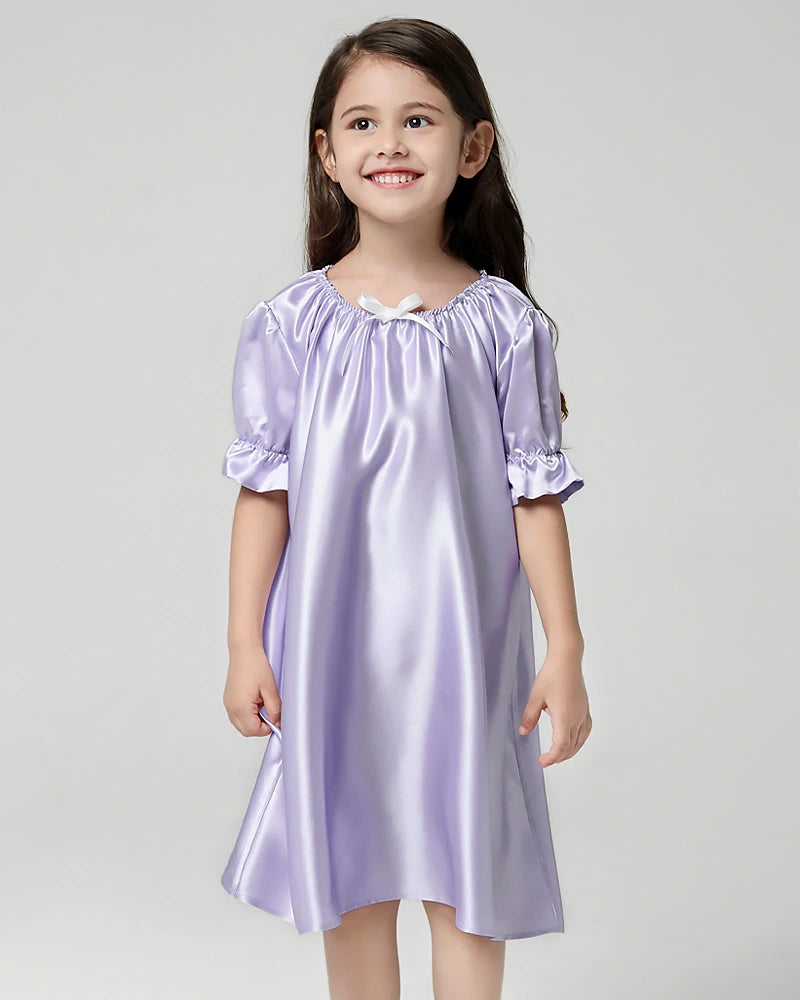 La chemise de nuit en soie pour fille DaisySilk offre un confort doux à l’heure du coucher grâce à son design en soie de mûrier, spécialement pensé pour la peau jeune et sensible. Cette robe de nuit en soie pour enfant présente un joli col rond froncé, des manches courtes à volants et un délicat nœud sur la poitrine, créant un style à la fois mignon et élégant que les petites filles adoreront.