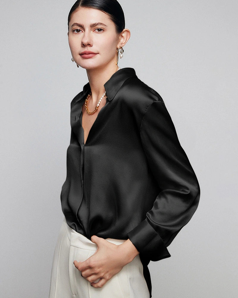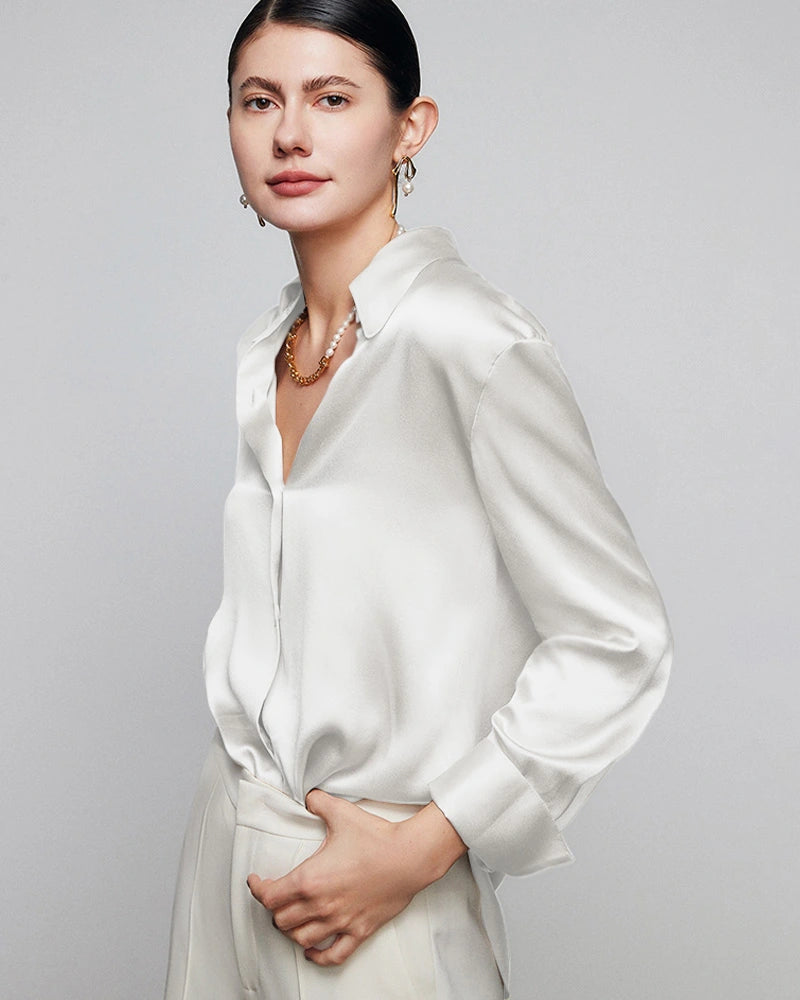 Confectionnée en crêpe de Chine de soie 30 momme, cette chemise en soie offre un luxe et une durabilité supérieurs aux chemises en soie classiques. Le poids plus lourd de 30 momme lui confère un tombé élégant, un mouvement fluide et une brillance naturelle, à la fois somptueuse et résistante. Cette chemise en soie pour femme résiste aux plis, offre une meilleure opacité et garde sa forme au fil du temps. Sa texture lisse procure une sensation fraîche et douce sur la peau, idéale en toute saison.
