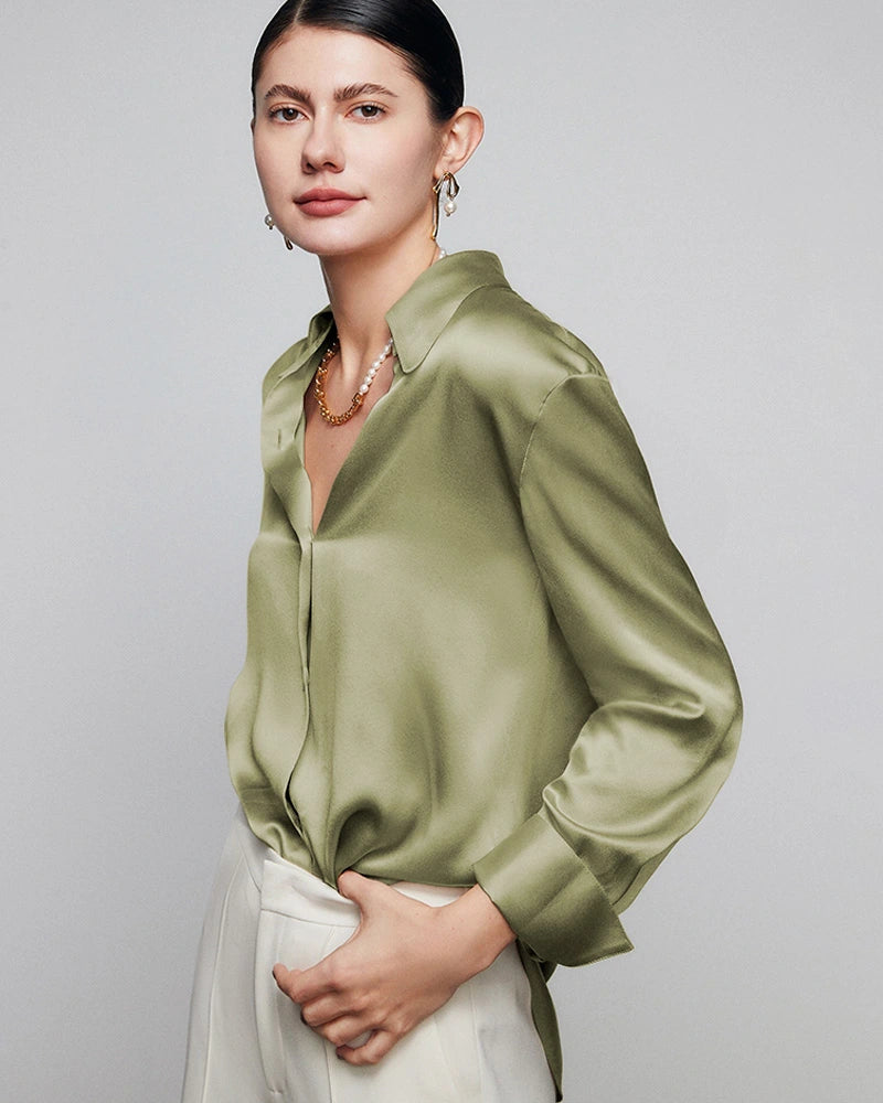 Cette chemise ample à épaules tombantes allie élégance intemporelle et modernité décontractée. Sa coupe fluide et ses épaules descendues offrent une silhouette féminine sans contrainte. La patte de boutonnage classique permet plusieurs styles – portée ouverte sur un caraco ou boutonnée pour une allure raffinée. Disponible en blanc, noir, vert, rose et crème, cette chemise en soie s’adapte facilement du bureau au dîner.