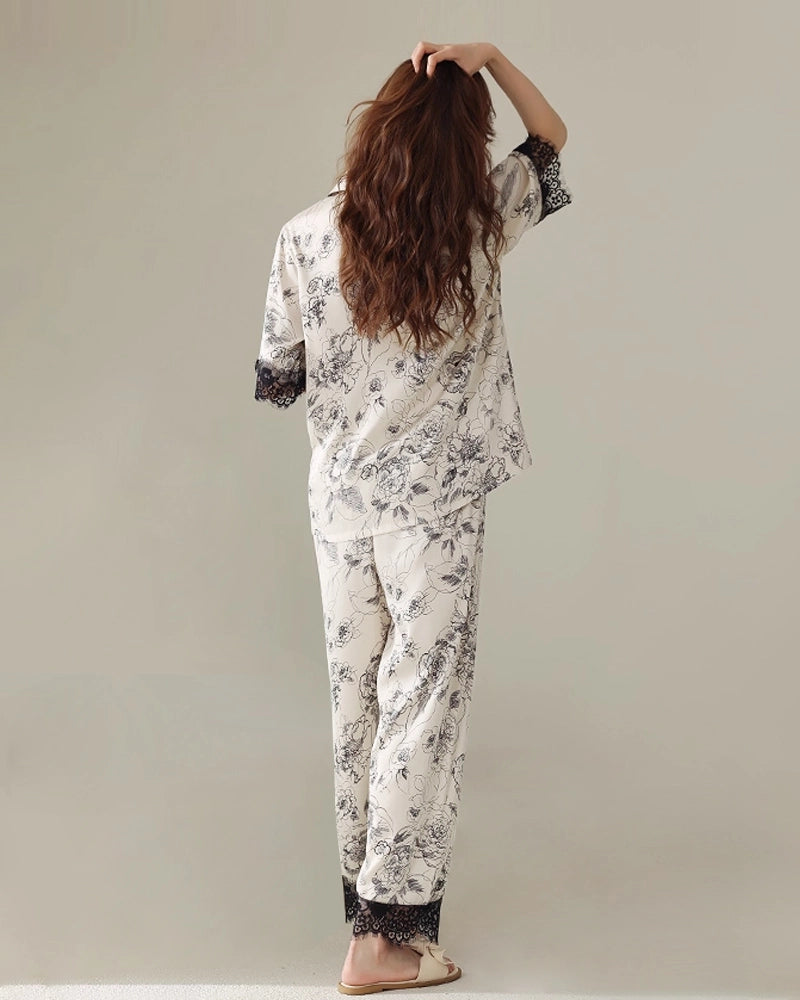 Ce pyjama en soie à motif floral présente de délicates fleurs en contour blanc, agrémentées de dentelle noire au niveau des manches et des ourlets de pantalon pour une touche féminine et raffinée. Le haut à manches courtes et le pantalon long offrent une coupe décontractée, garantissant confort et liberté de mouvement. Conçu dans des tons pastel doux, cet ensemble de pyjama floral à manches courtes allie style ludique et détails sophistiqués.