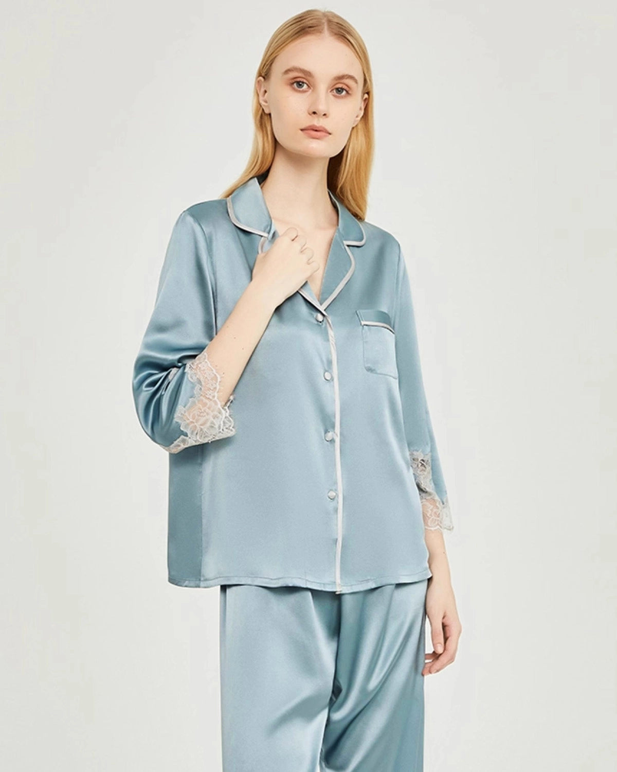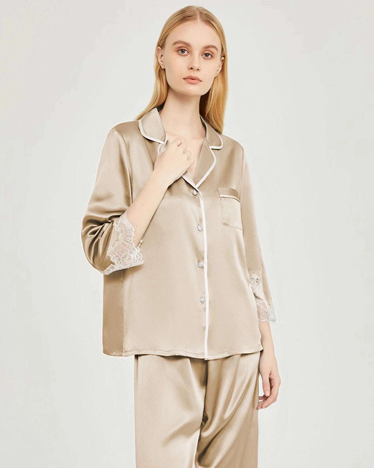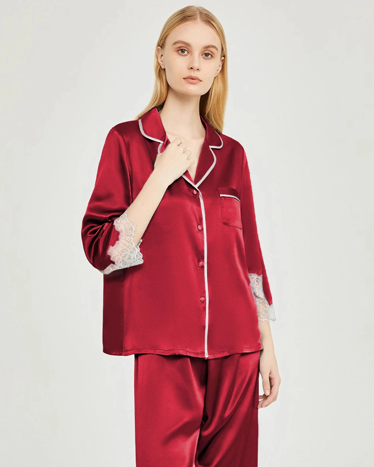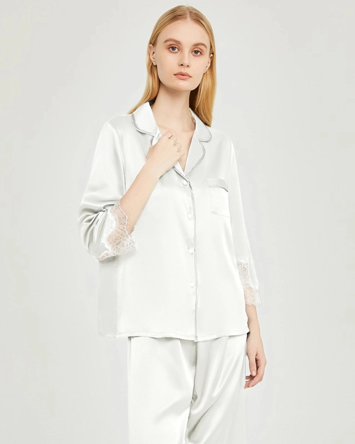 Ce pyjama en soie avec bordure en dentelle pour femme présente des manches mi-longues et un pantalon long, magnifiquement soulignés par de délicates finitions en dentelle aux poignets et aux ourlets. Les détails raffinés mettent en avant le charme féminin, alliant élégance moderne et allure nuptiale classique — parfait pour les matins de mariage, les pyjamas en soie pour demoiselles d’honneur ou les moments de détente en lune de miel.