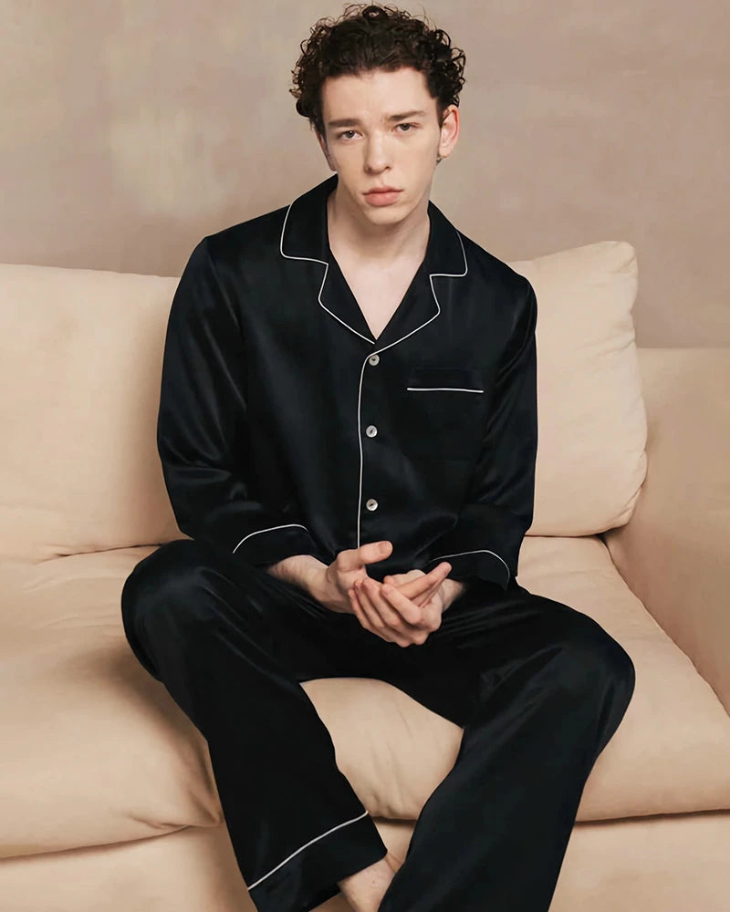 Avec son col à revers classique, son haut à manches longues et son pantalon long, cet ensemble constitue un choix sophistiqué parmi les tenues de détente pour homme en soie. Disponible en noir intemporel, il revisite avec raffinement le pyjama en soie noir pour homme – idéal pour ceux qui recherchent un pyjama en soie masculin ou un ensemble de pyjama élégant en soie pour homme.
