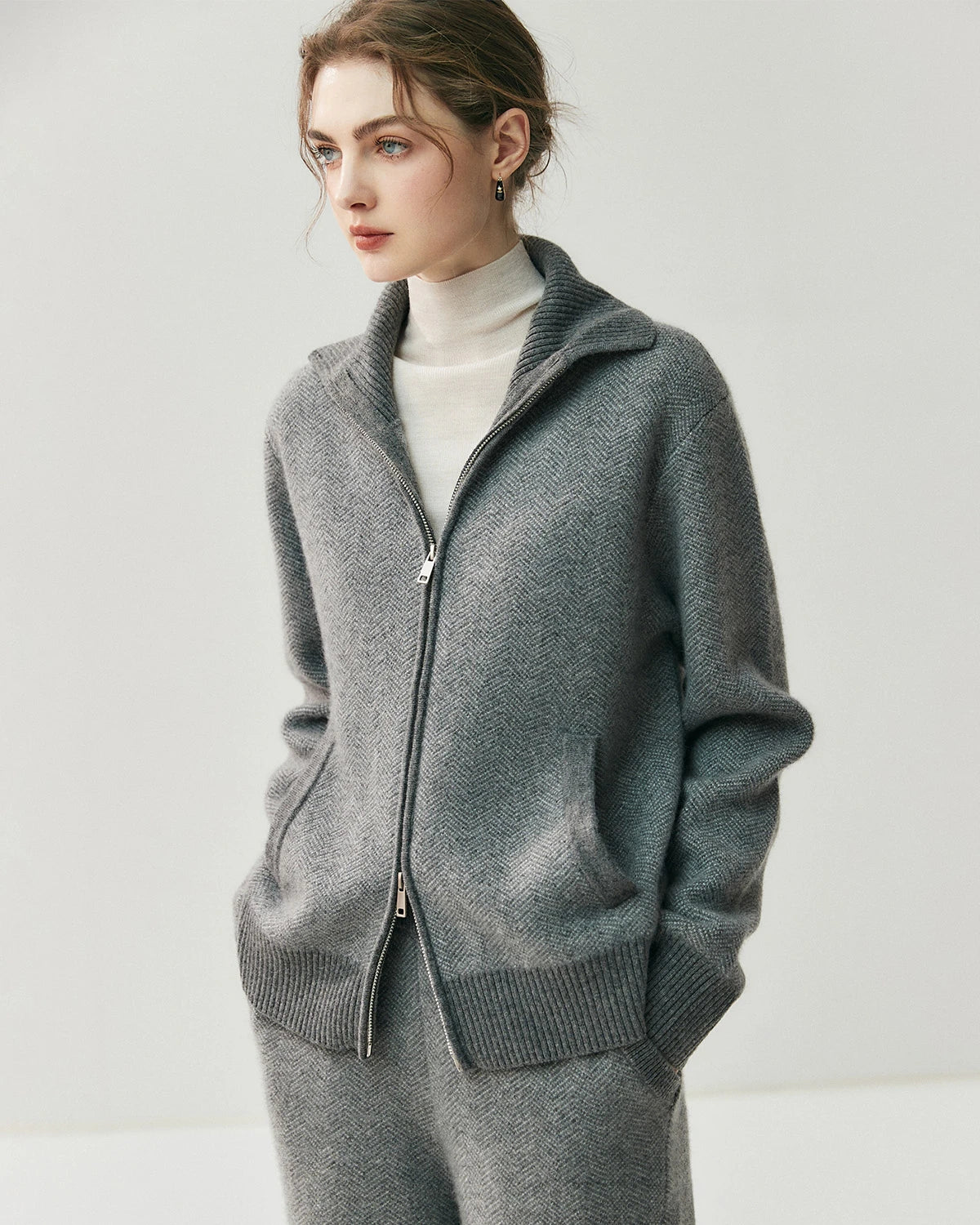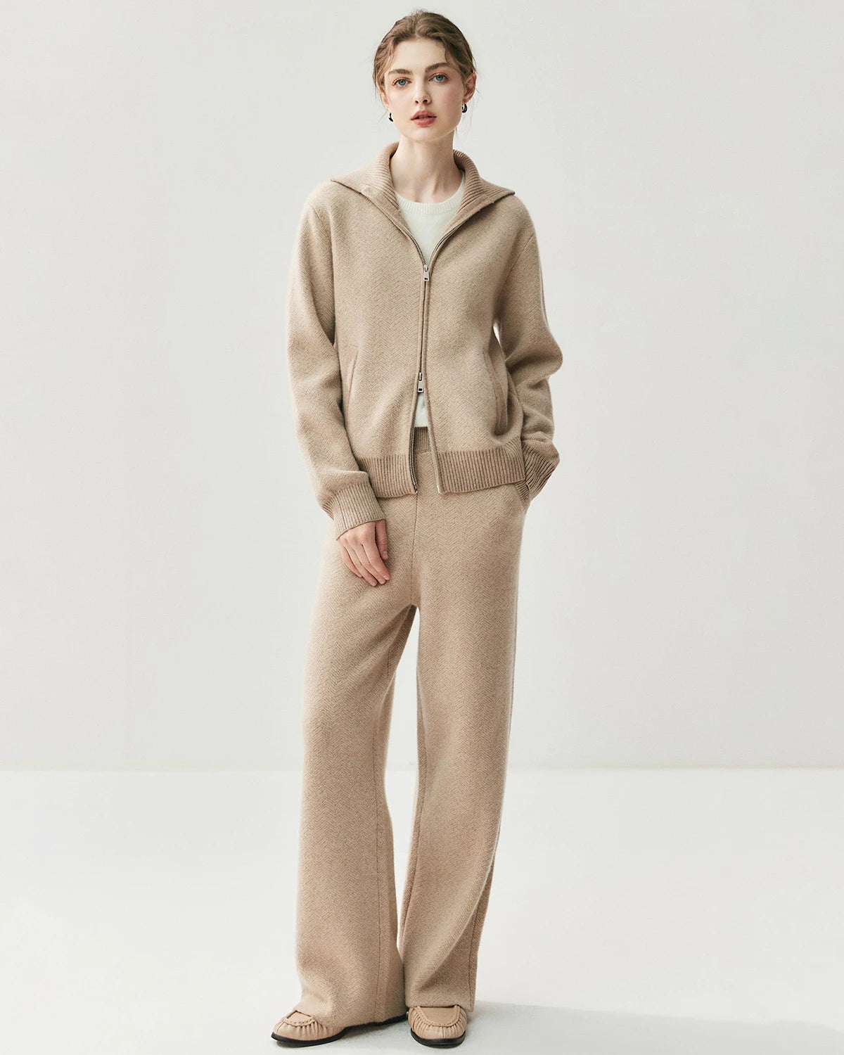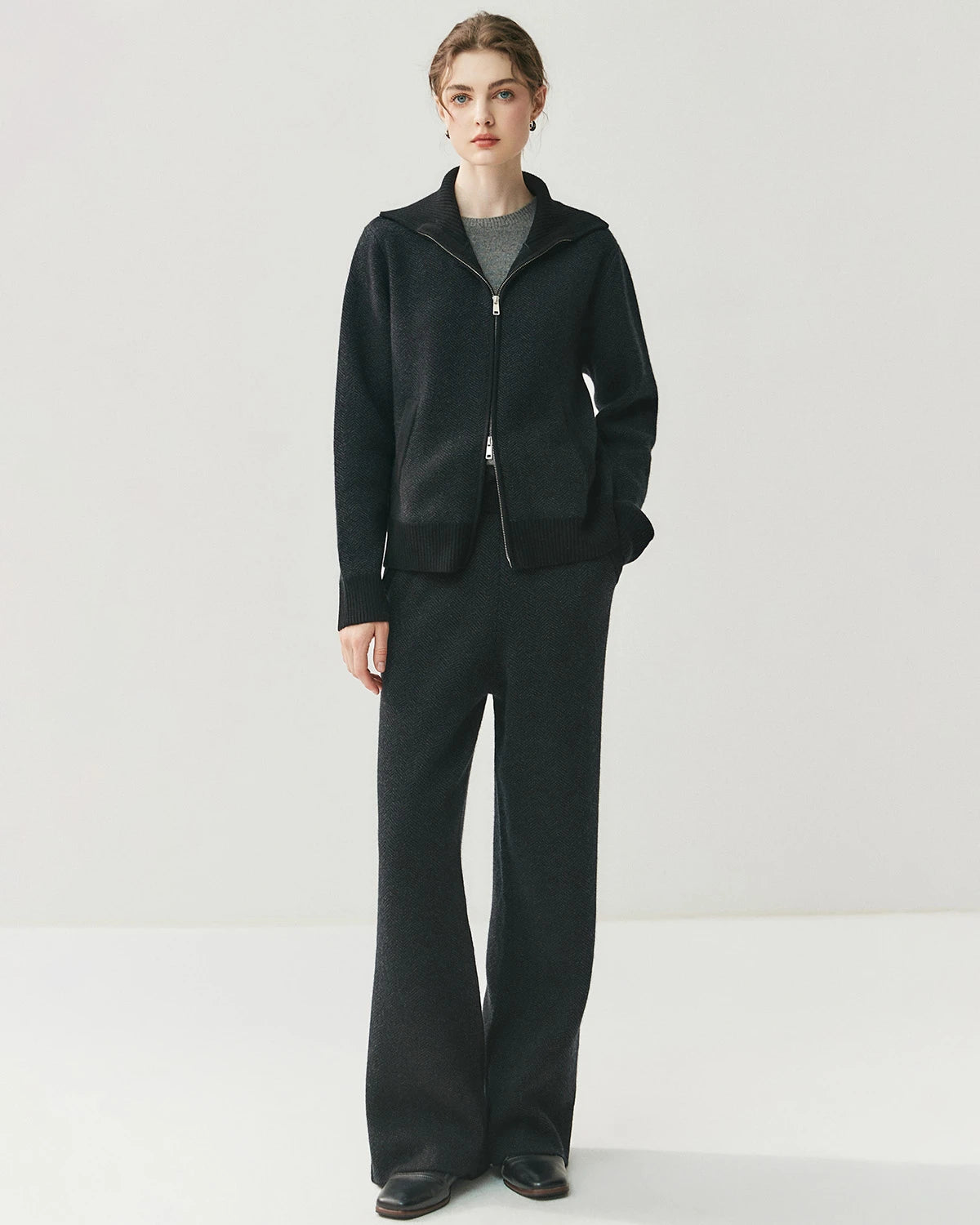 Le confort raffiné rencontre le design intemporel dans l’ensemble cardigan zippé et pantalon en laine et cachemire DaisySilk. Tissé à partir d’un mélange premium de 65 % de laine et 35 % de cachemire, cet ensemble en cachemire pour femme offre un équilibre parfait entre douceur, chaleur et respirabilité. Le cardigan à col montant zippé à double sens est doté de poches latérales et d’un col pliable qui passe aisément d’un style décontracté à une allure élégante. Associé à un pantalon droit en cachemire, cet ensemble incarne le luxe discret — idéal pour voyager, se détendre ou composer une tenue chic et décontractée.