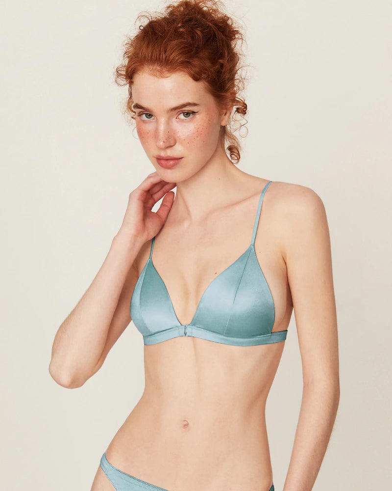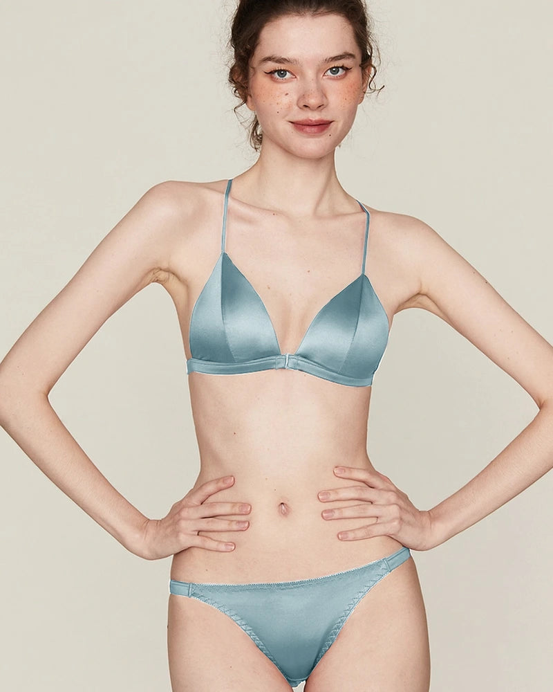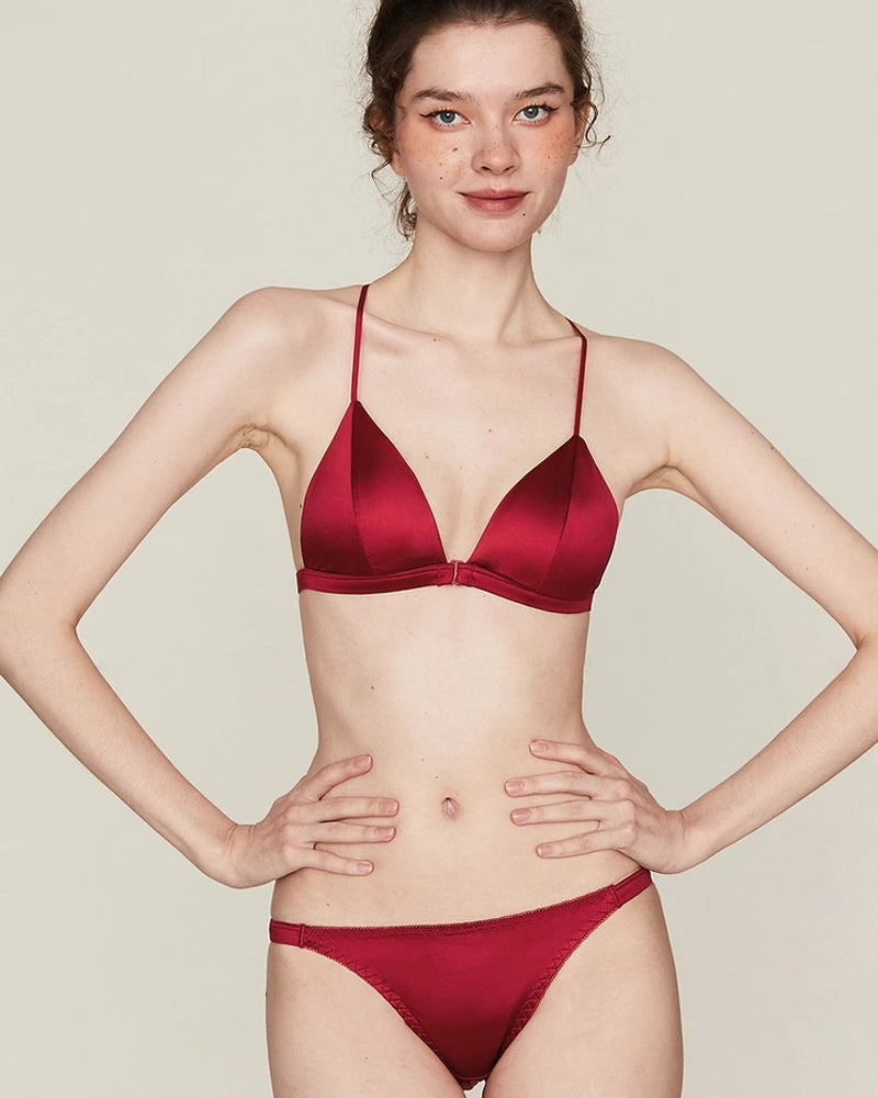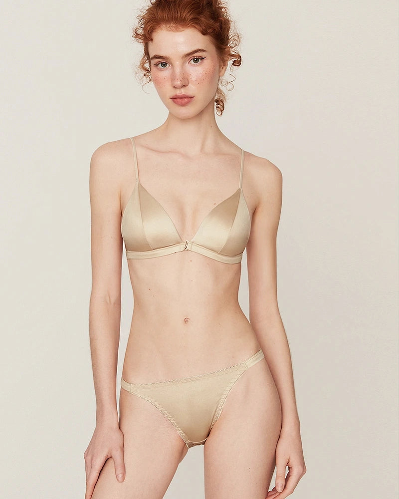 Le design en brassière triangle assure une légère mise en forme tout en conservant la douceur caractéristique des soutiens-gorge et culottes en soie. Que vous préfériez un soutien-gorge sans armature, une brassière sans fil ou un modèle minimiseur, cette pièce allie luxe et praticité. Le modèle à fermeture avant offre commodité et élégance, et constitue également une excellente option pour les femmes qui apprécient les soutiens-gorge frontaux sans armature.