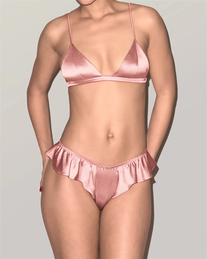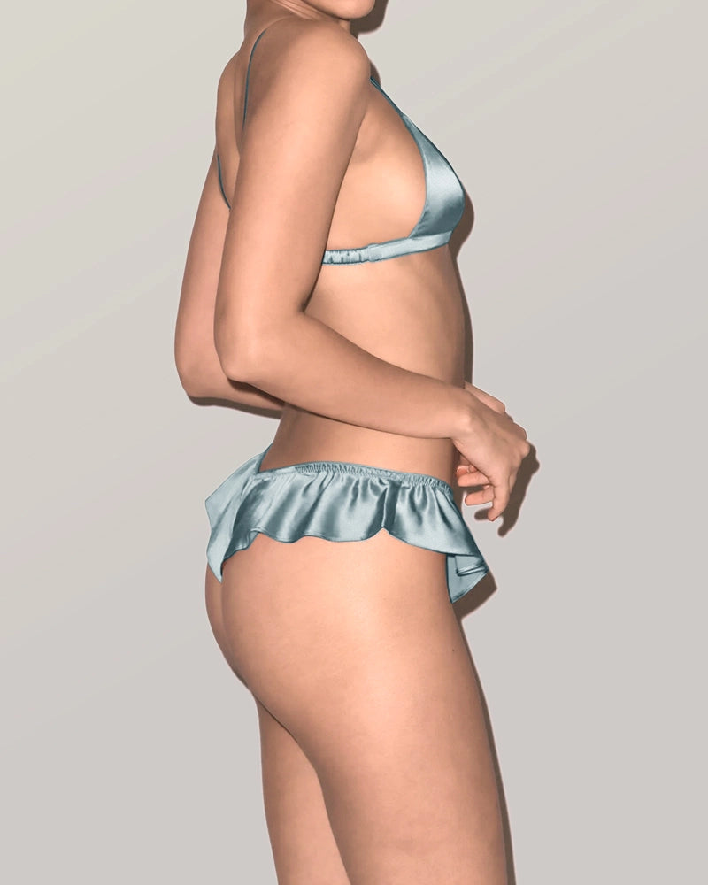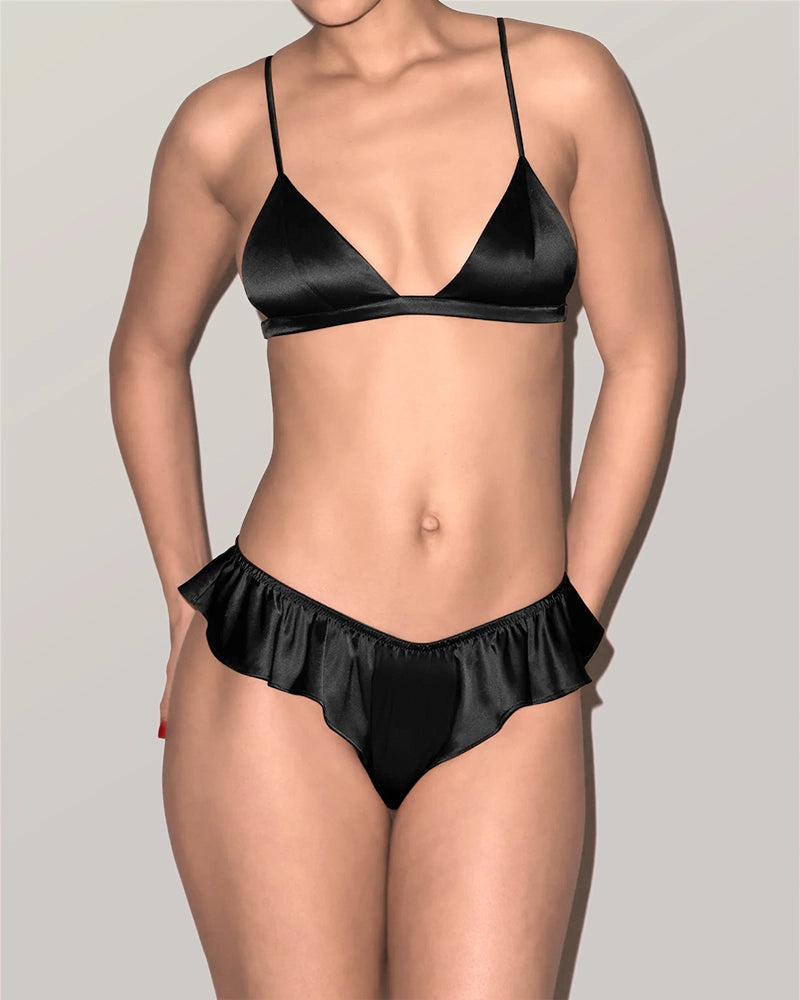 L'ensemble comprend un soutien-gorge triangle sans armatures et un string assorti avec finitions volantées. Le bralette en soie offre une forme douce et naturelle, tandis que le bord volanté ajoute une touche féminine et romantique. Parfait pour celles qui recherchent des ensembles lingerie en soie à la fois élégants et délicats.
