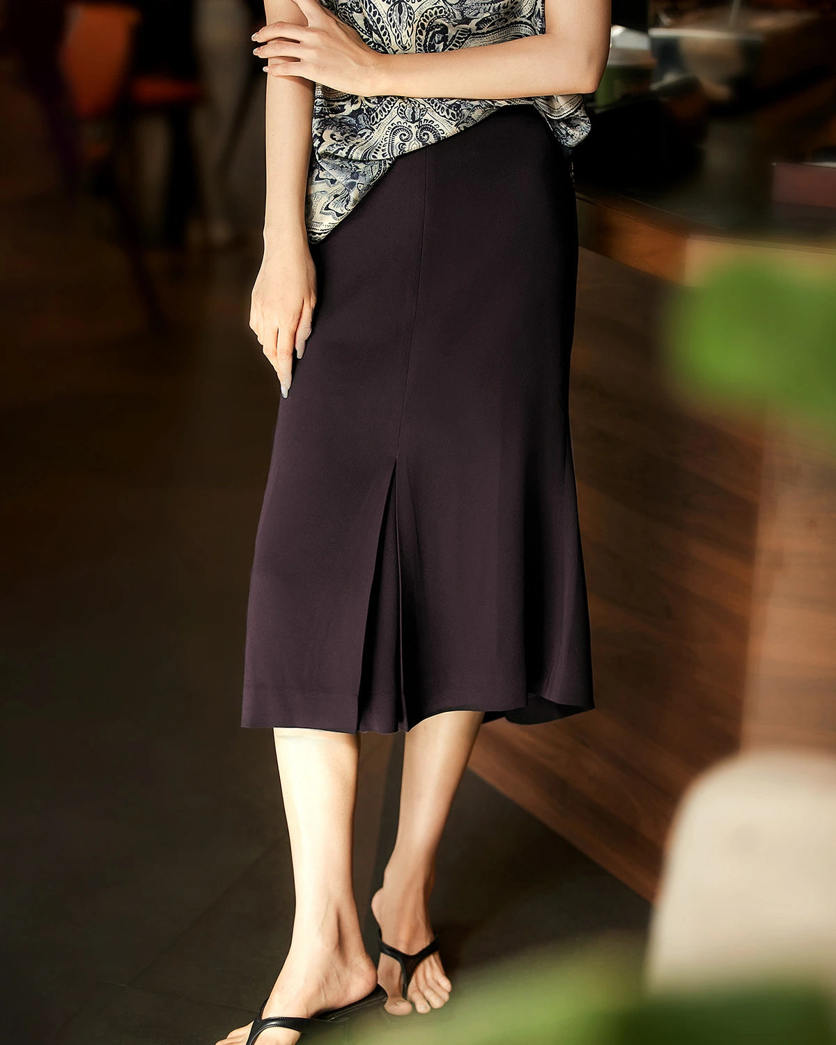 À l'approche de l'automne, optez pour une jupe en soie aux teintes sombres classiques pour une touche de sophistication discrète. Par exemple, associez un chemisier en soie rose blush à une jupe midi taille haute en soie marron pour créer une parfaite harmonie de couleurs de transition, dégageant une allure élégante.