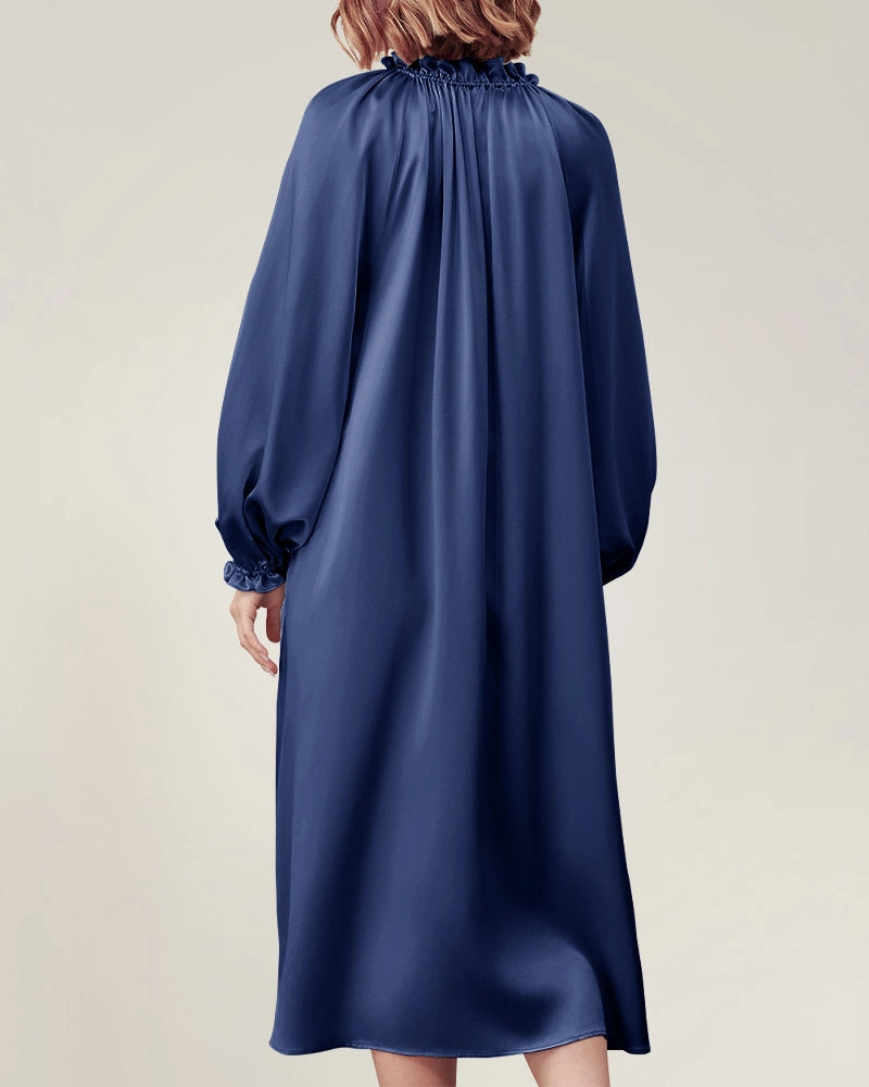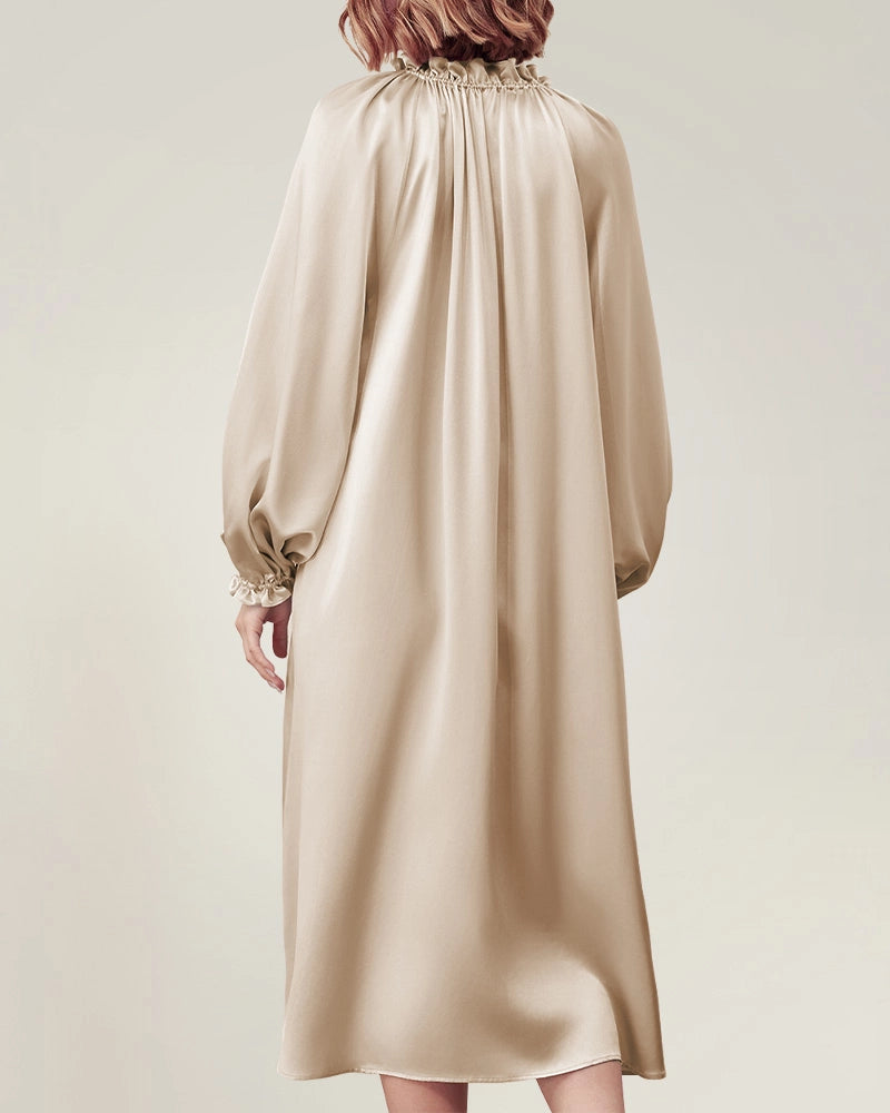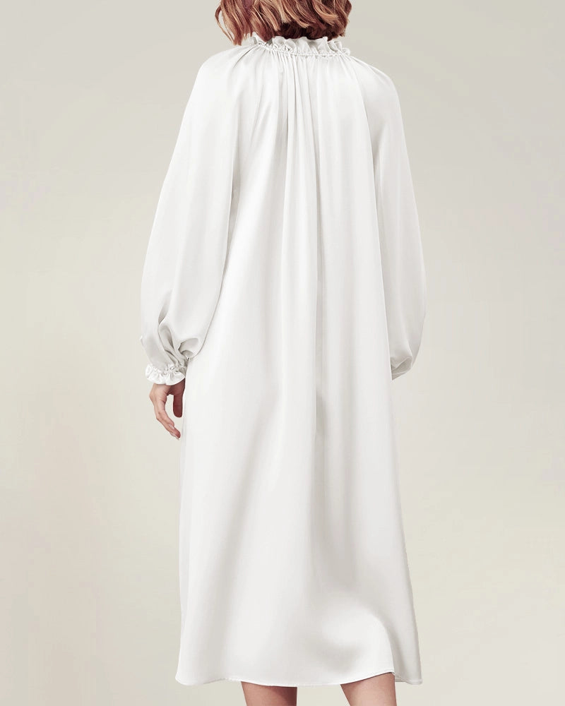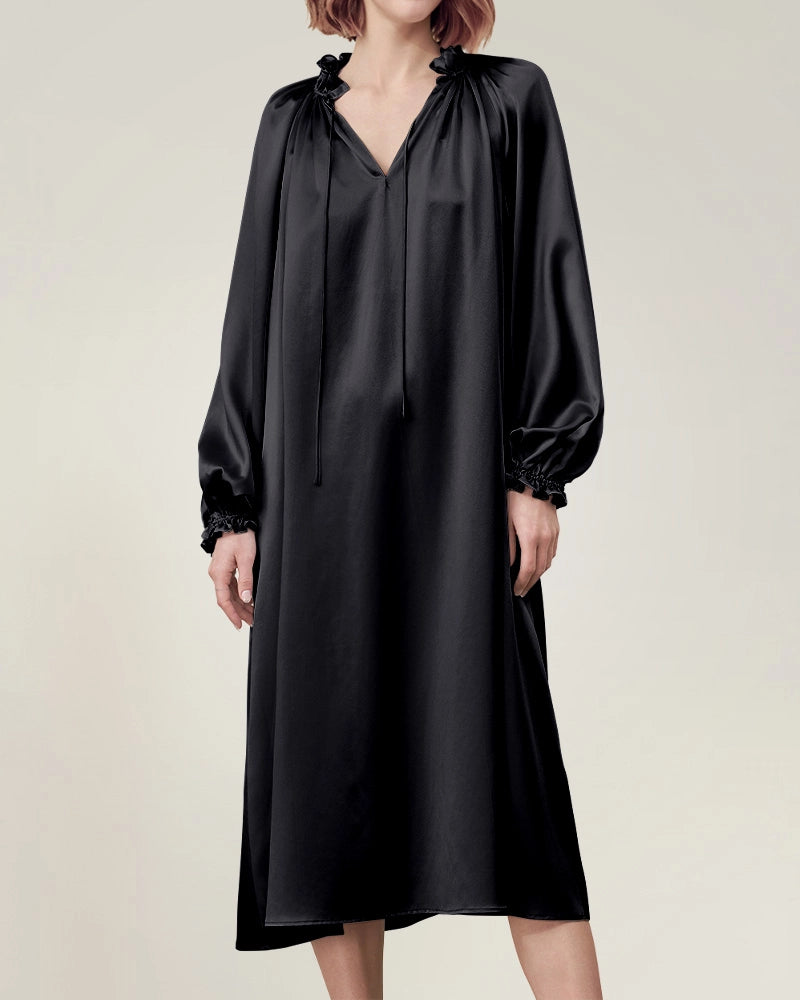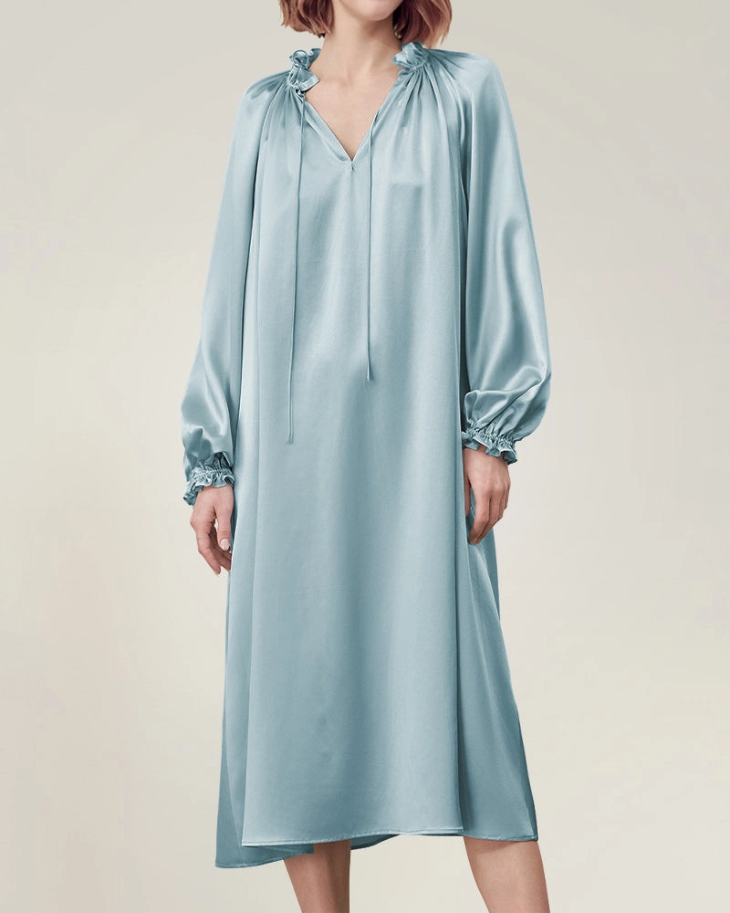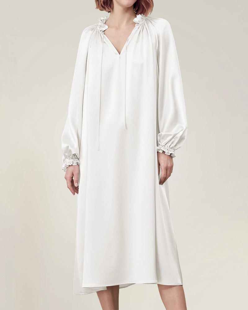 Dotée d’une coupe ample, d’un col fendu à volant avec lien ajustable, cette nuisette féminine évoque le charme des robes de nuit vintage ou victorien. Les manches longues et la fluidité de la matière créent un look élégant et gracieux, inspiré des silhouettes de l’époque victorienne. Sa longueur mi-cuisse et son col raffiné font de cette nuisette en soie un ajout intemporel à toute collection de nuitées féminines en soie.