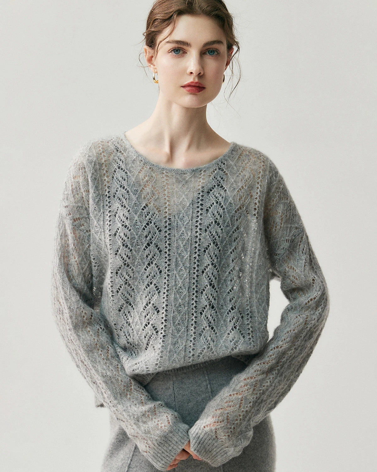 Ce pull léger à col rond présente des détails délicats en maille torsadée ajourée avec une silhouette raffinée. Conçu comme un pull en cachemire classique, il met en valeur un style intemporel et une polyvalence moderne. La structure fine du tricot le rend parfait comme pull en cachemire léger pour femmes, offrant une élégance qui passe facilement du jour à la nuit.