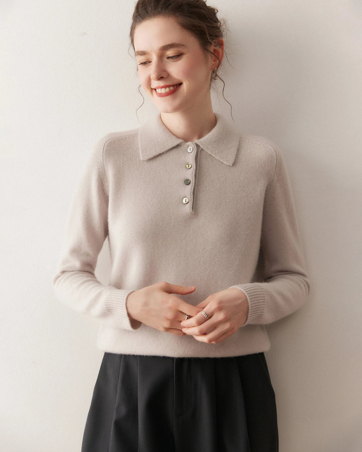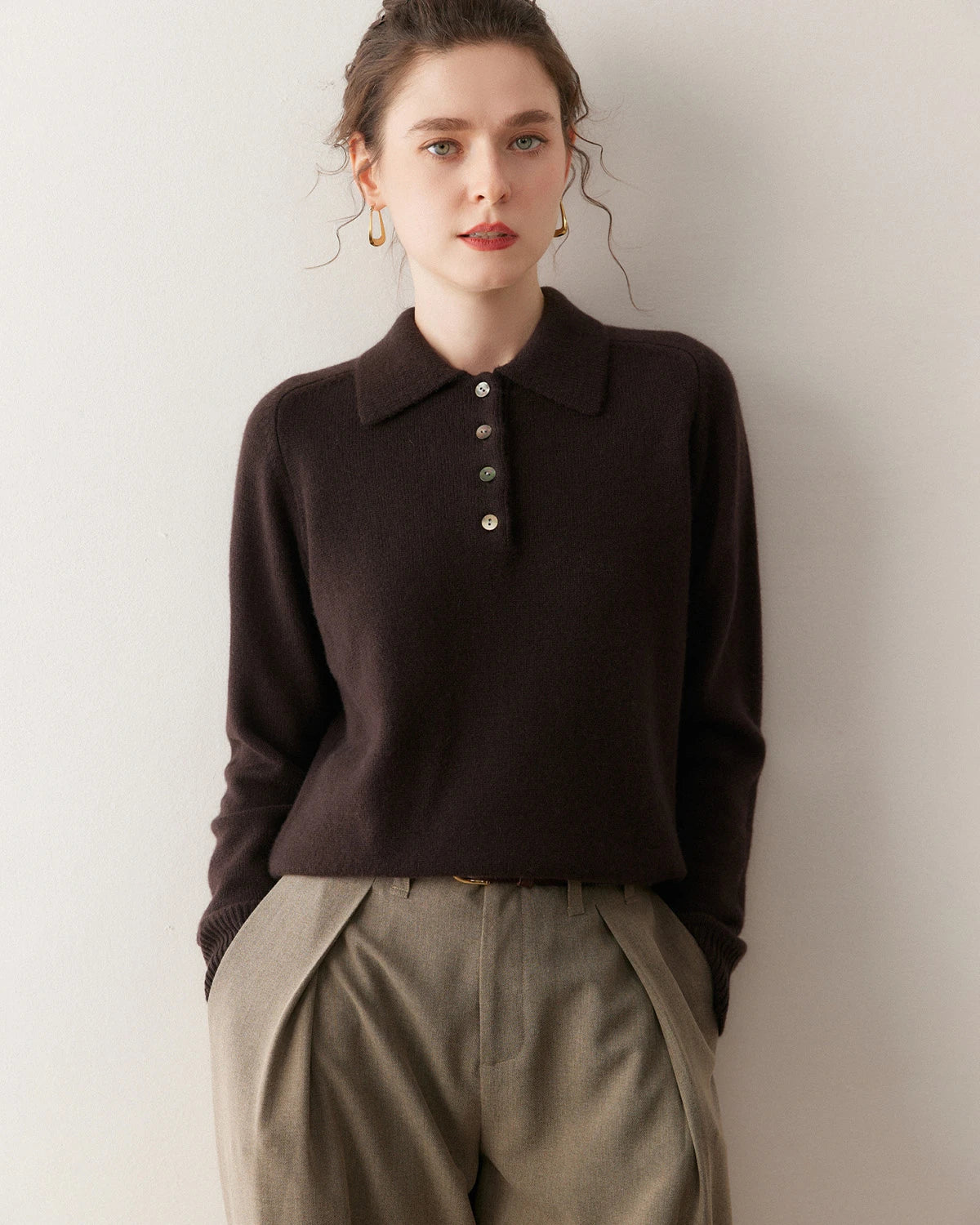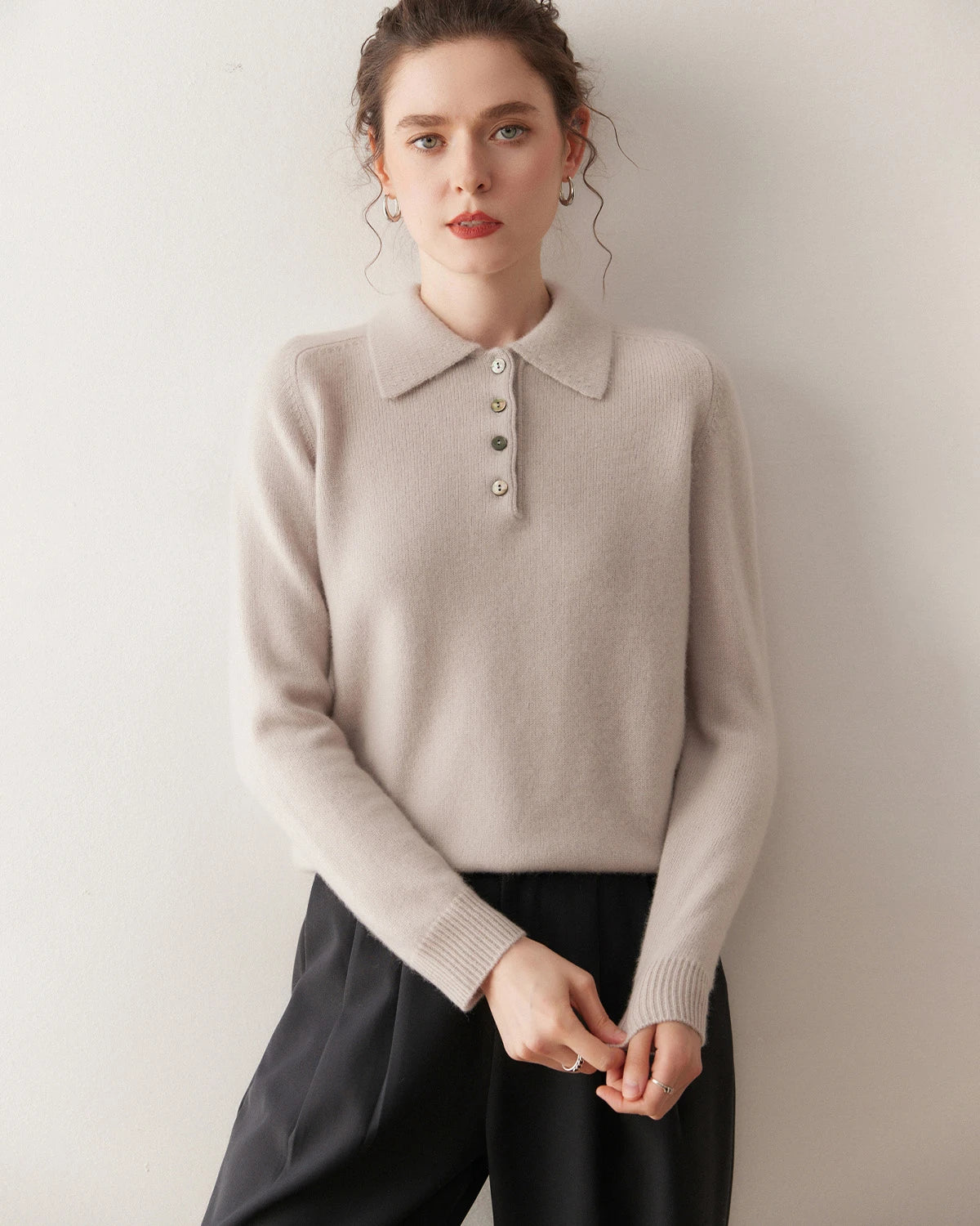 Doté d’un col polo avec patte de boutonnage à moitié et boutons en nacre naturels, ce pull en cachemire allie élégance et sophistication décontractée. L’épaule selle classique améliore la structure et le style, en accord avec les tendances des pulls en cachemire pour femmes, pull à col roulé en cachemire et collections de cardigans chics en cachemire pour femmes.