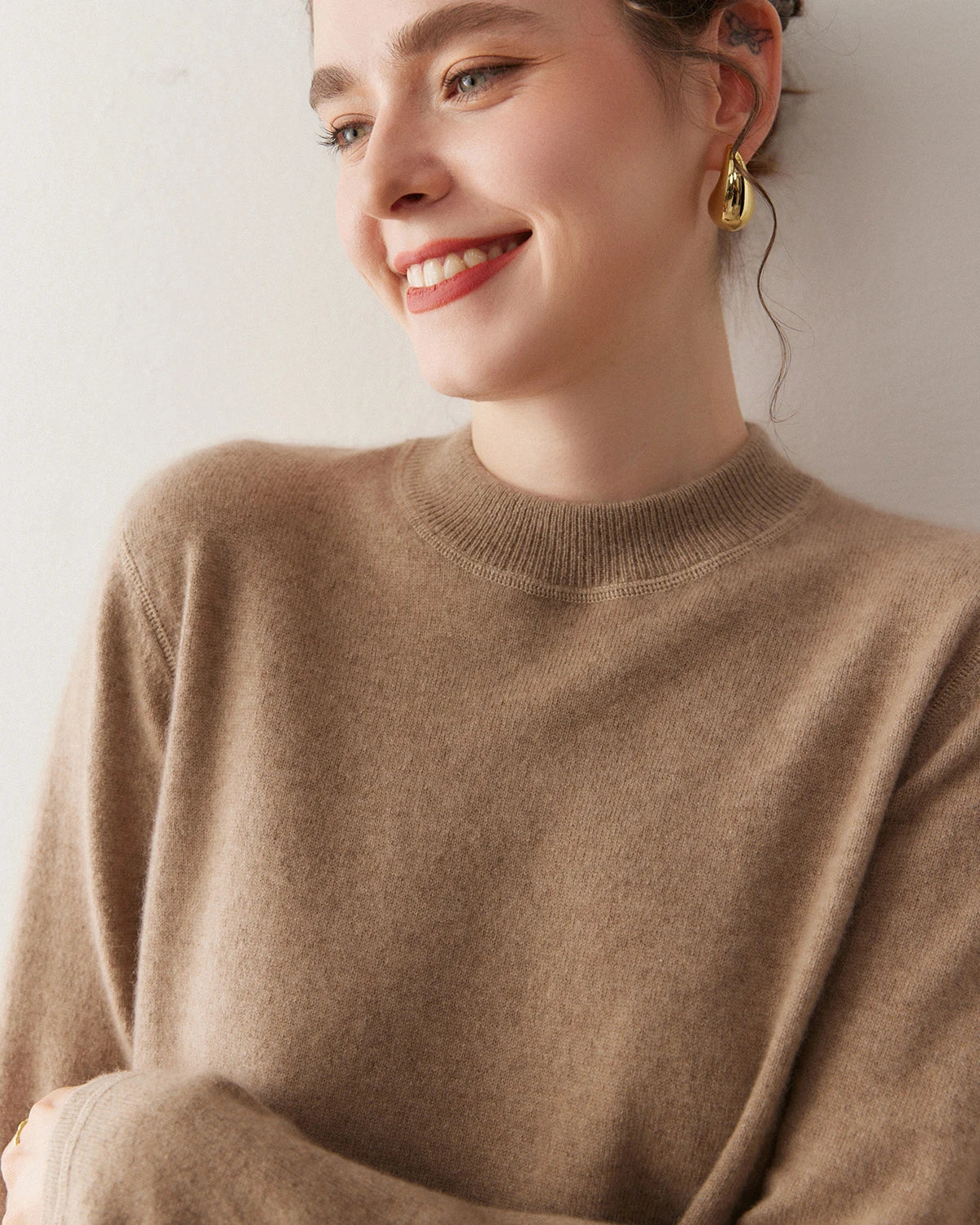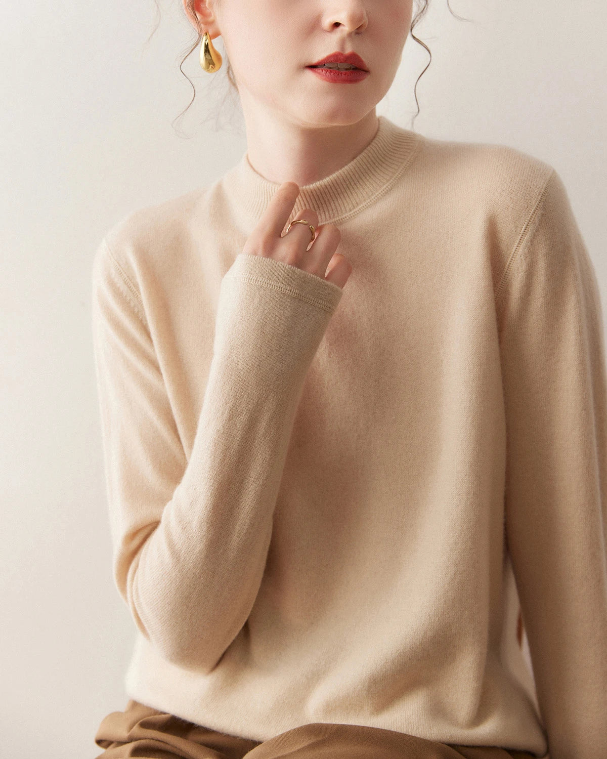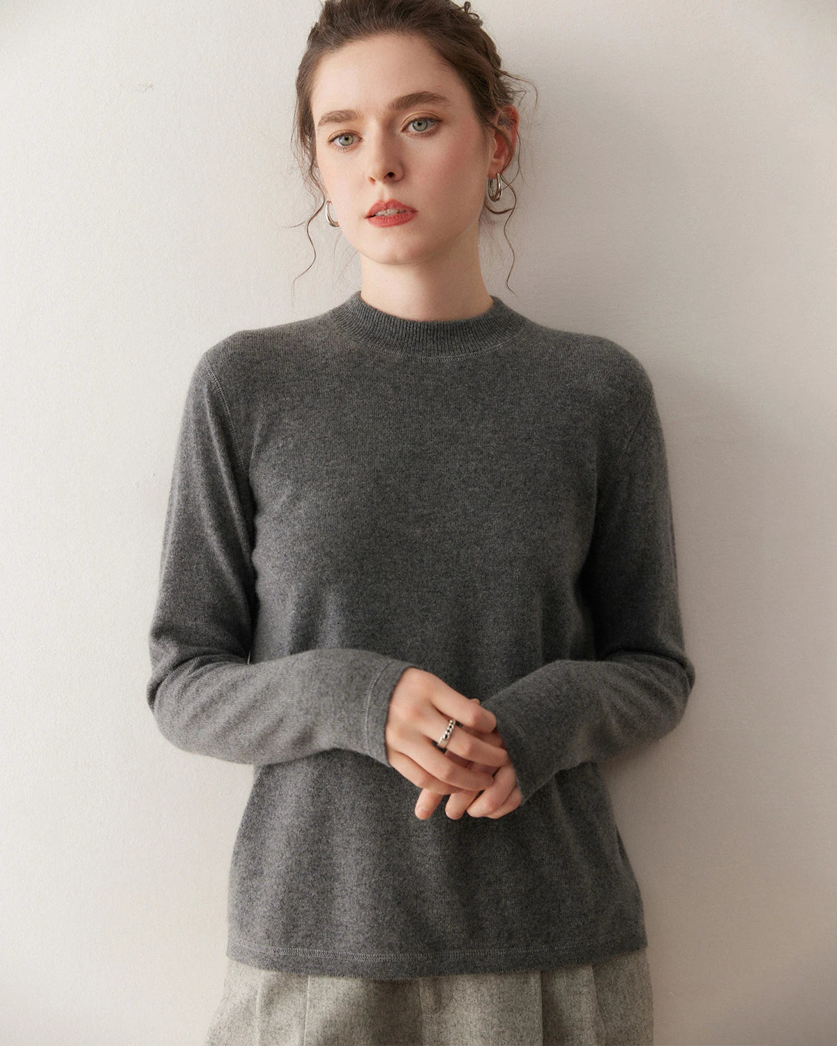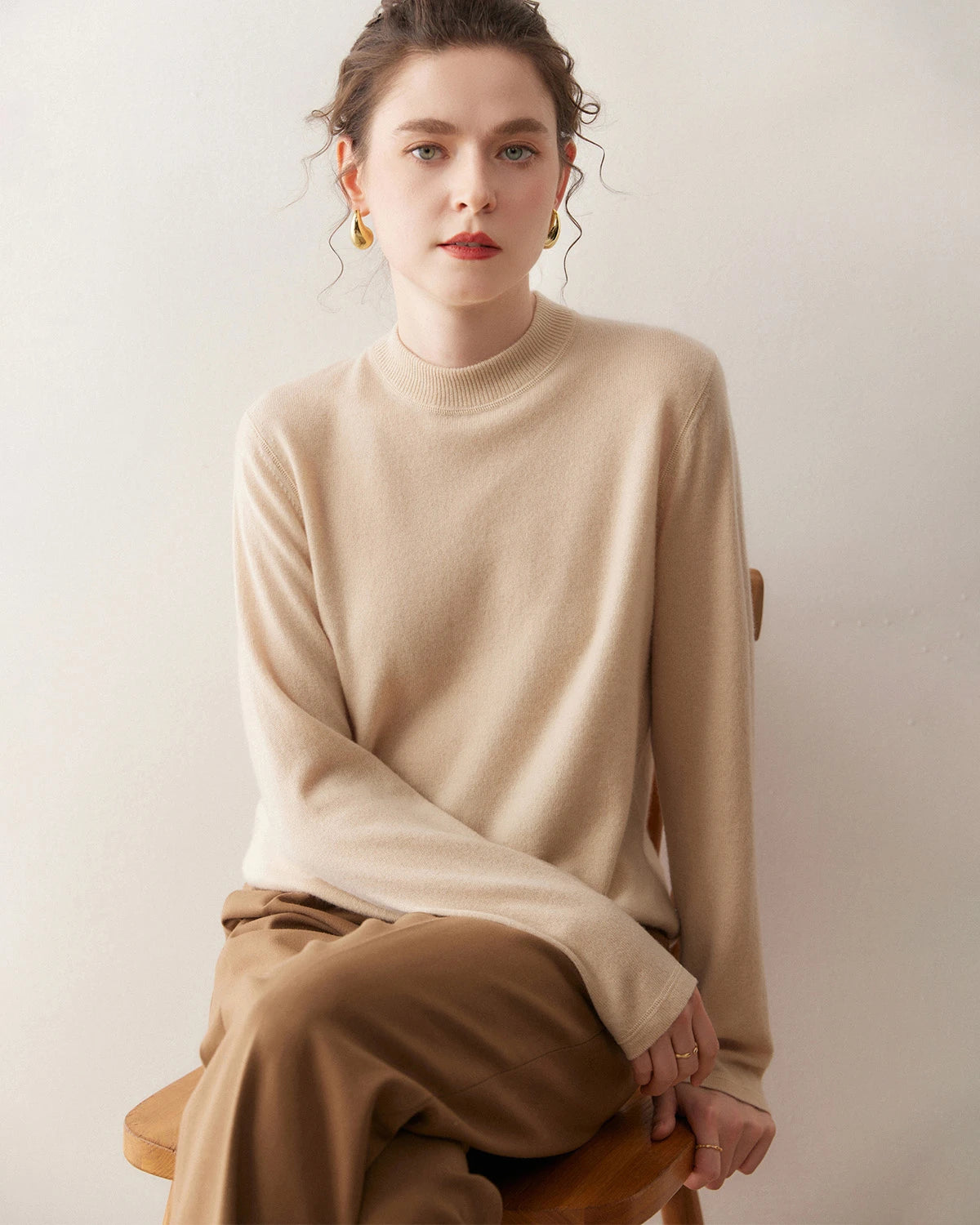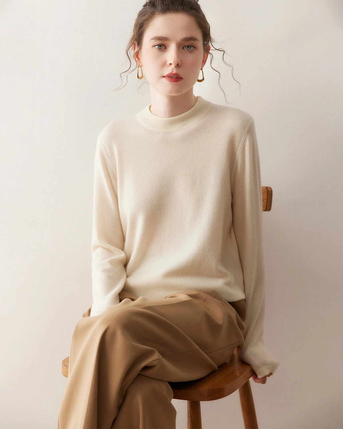 Ce pull en cachemire présente un col montant raffiné et des coutures plates lisses — la même technique utilisée pour les T-shirts haut de gamme — pour un look à la fois décontracté et élégant. Sa coupe minimaliste en fait l’un des pulls en cachemire pour femme les plus polyvalents de votre garde-robe.