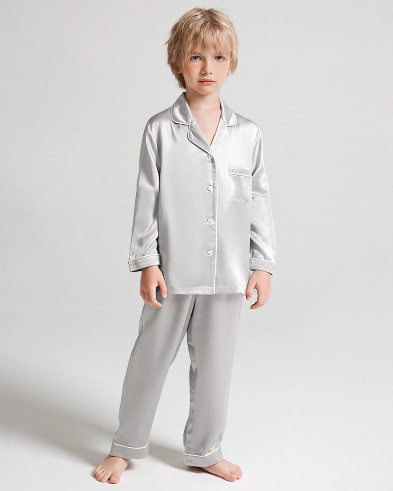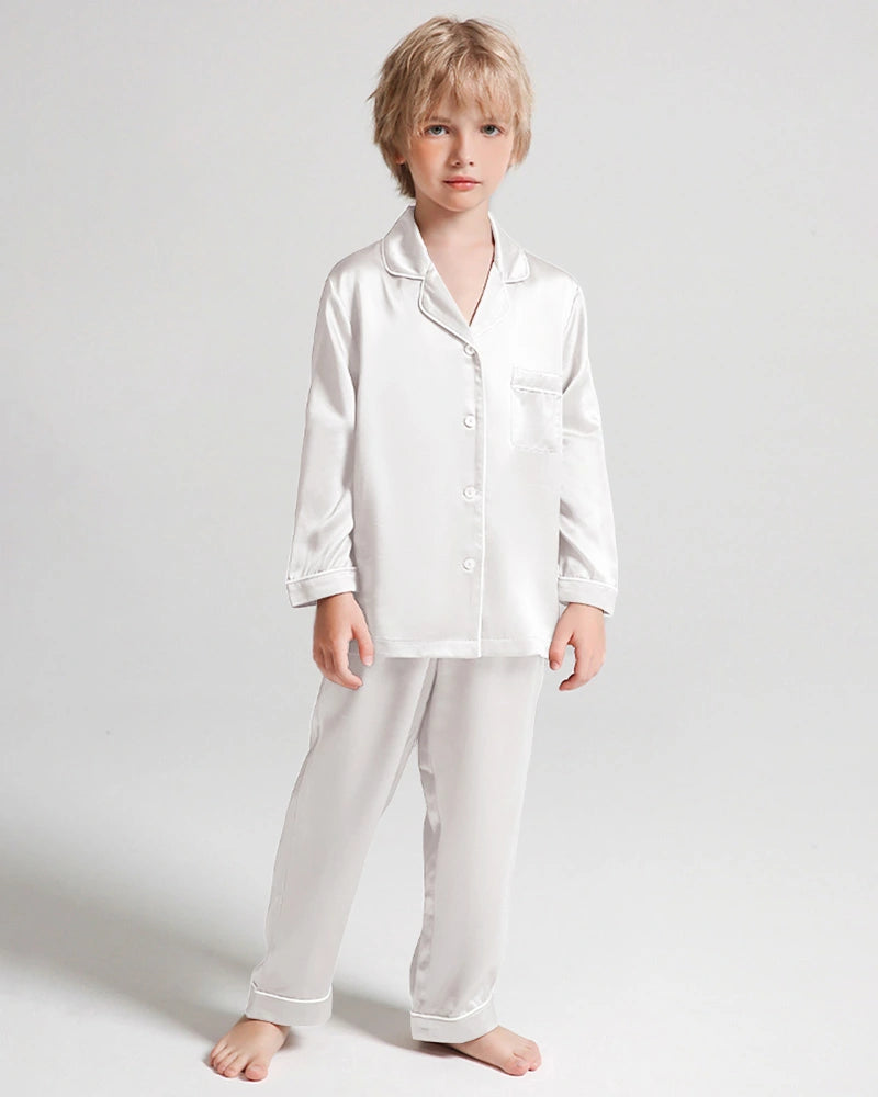 Cette tenue de nuit en soie pour enfants est idéale comme pyjama en soie pour garçons, loungewear en soie pour enfants ou pyjama quotidien en soie de mûrier pour se détendre, dormir ou profiter des week-ends. Un essentiel raffiné et confortable pour les garçons de tout âge.