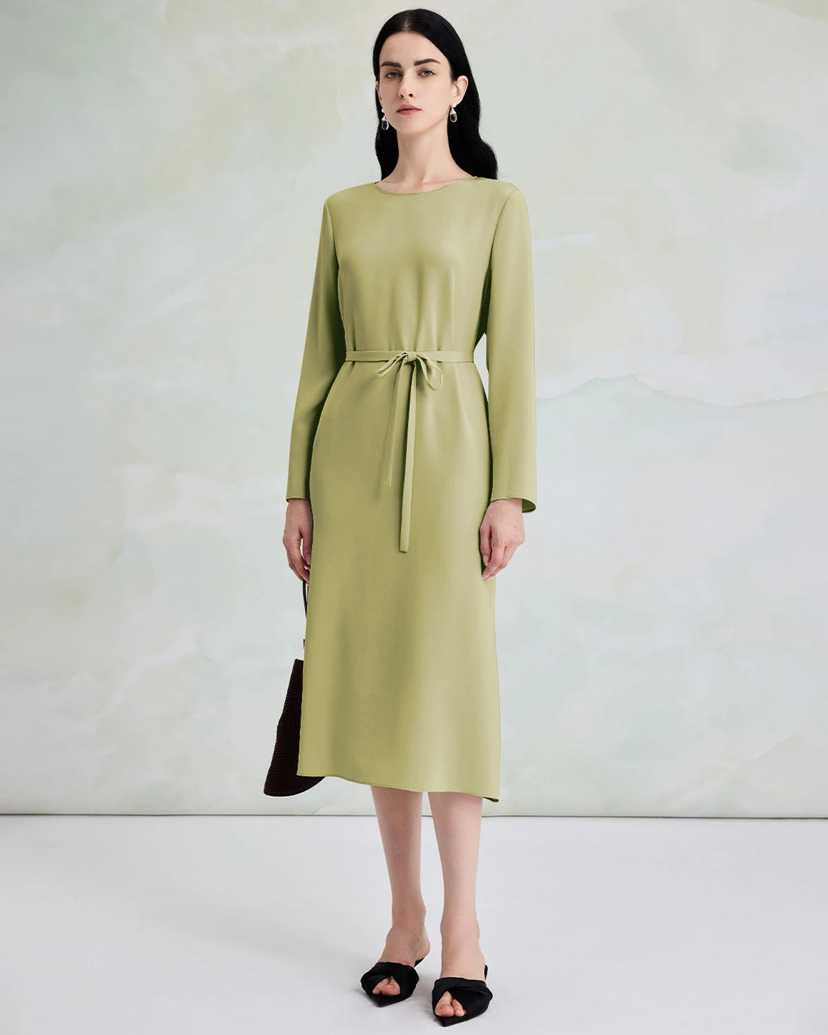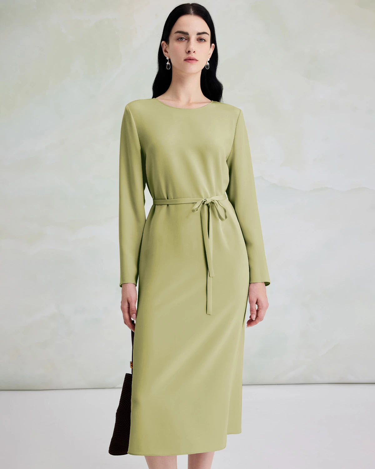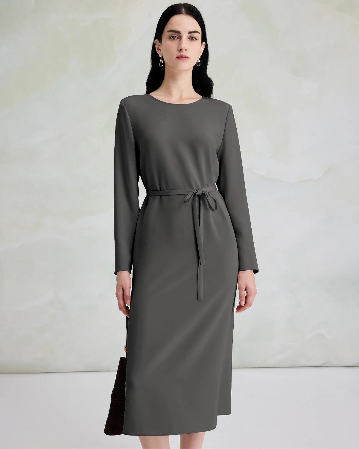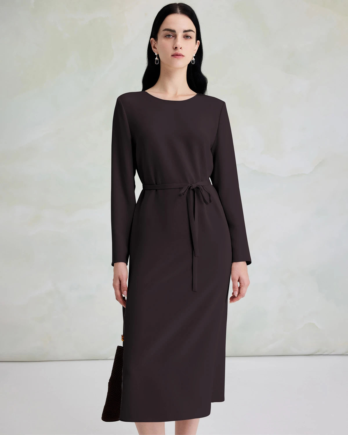 Cette robe midi de travail présente un col rond classique, des manches longues et une ceinture ajustable à la taille pour une coupe flatteuse.
